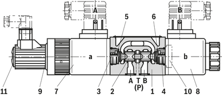 在非致動狀態(tài)下,控制滑塊 (2) 被磁鐵的復(fù)位彈簧保持在機(jī)械中心位置。對于控制閥芯符號“V”,這與液壓中心位置不符!當(dāng)電動閥控制回路關(guān)閉時,控制滑塊位于液壓中心位置。